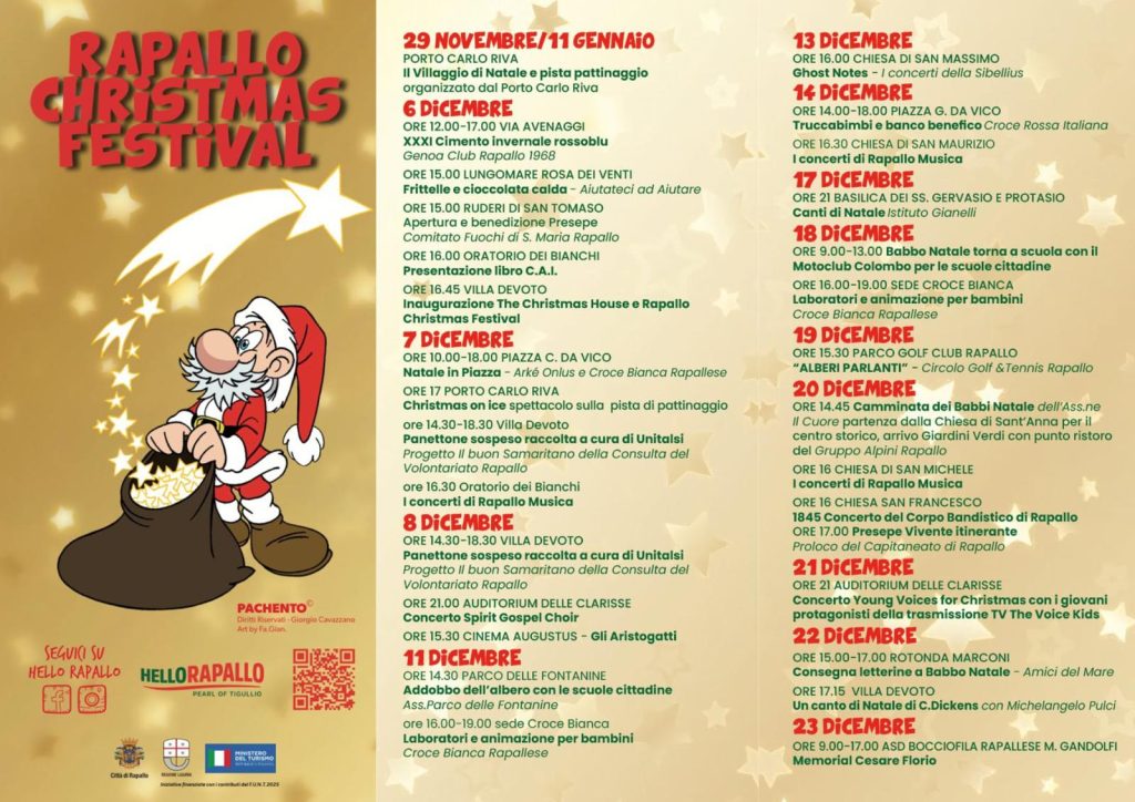 Cinema gratuito per bambini all’Augustus, villaggio di Natale con pista di pattinaggio al porto Carlo Riva, Alberi parlanti al Golf Club, concerti e Gospel Choir, teatro, cabaret e animazioni in città. Per festeggiare il nuovo anno “Midnight in Rapallo” e il Capodanno dei piccoli a Villa Devoto. Gran finale con la Befana che viene dal mare!
