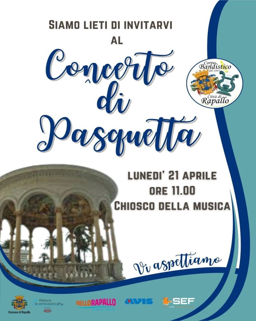 – ore 11:00 Concerto di Pasquetta Corpo Bandistico di Rapallo, presso il Chiosco della Musica