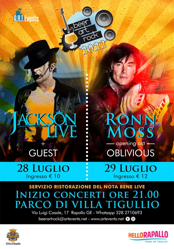 Due spettacoli per un grande ritorno! Il mega show tributo al Re del Pop Michael Jackson a cura di Andrea Imparato e una serata musicale insieme a Ronn Moss… non solo Ridge ma anche rock, nel Parco di Villa Tigullio nel cuore di Rapallo.